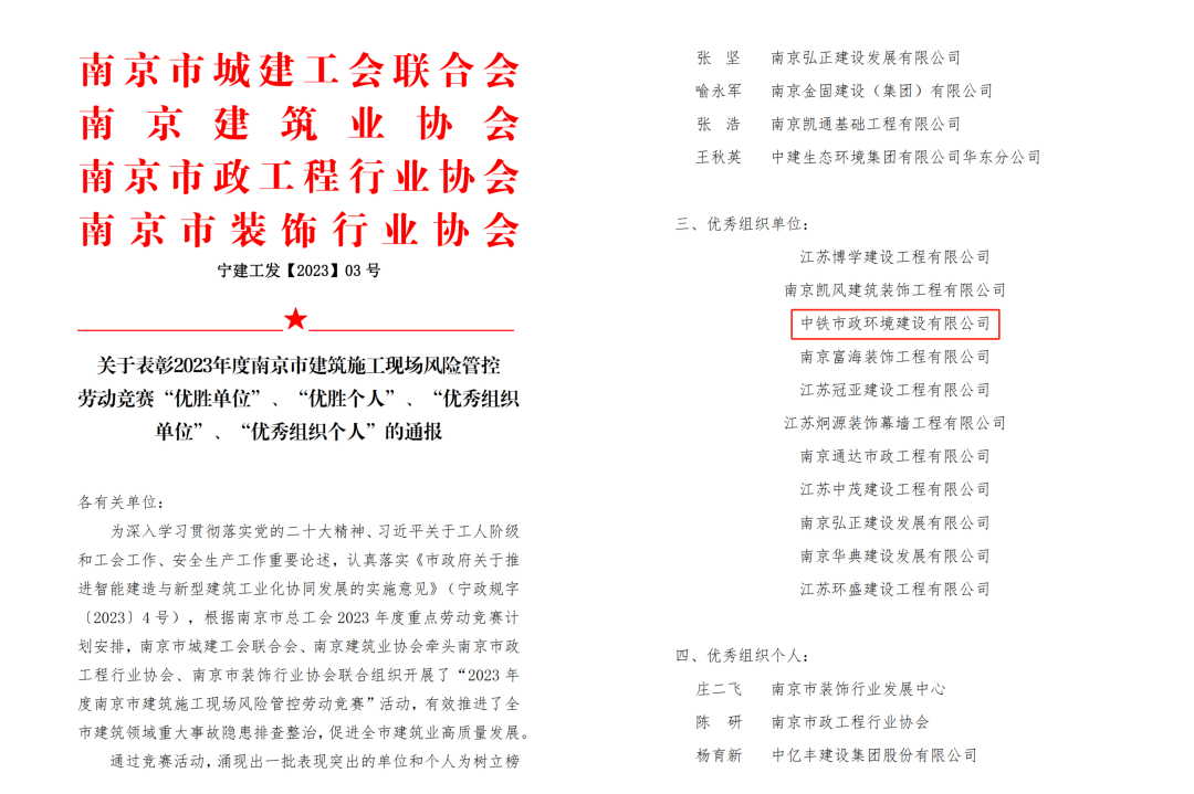 11月13日,2023年度南京市建筑施工現(xiàn)場風(fēng)險(xiǎn)管控勞動(dòng)競賽表彰名單公示,南京龍袍項(xiàng)目代表公司獲得“優(yōu)秀組織單位”表彰。...