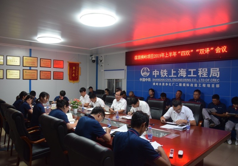617日,橫嶺水質凈化廠二期提標改造工程項目黨支部召開2019年上半年“四雙”“雙評”會議。項目部全體黨員、部分職工代表和外協隊伍參加評議。(唐妤婕)