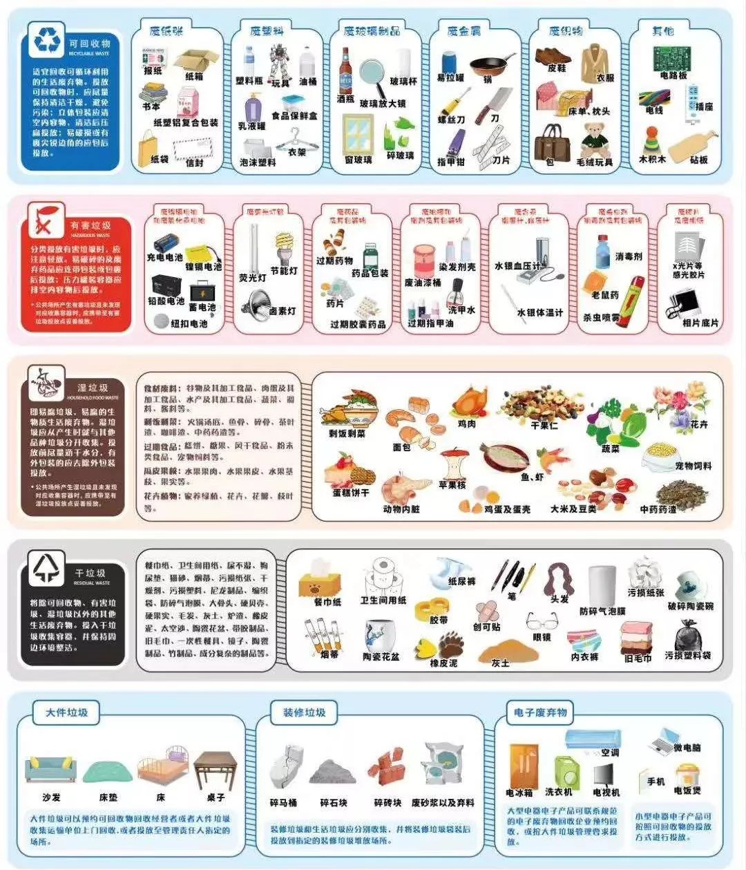 按照可回收物、有害垃圾、干垃圾和濕垃圾的生活垃圾四分類法進行垃圾分類。