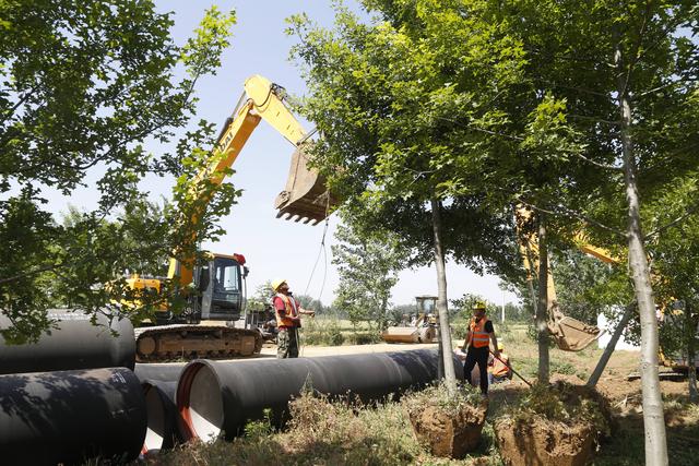 在主管網鋪設同時,部分支線管網也開始鋪設。依據設計要求,施工方按照沿路、沿河鋪設的方案,盡可能減少開挖面積。