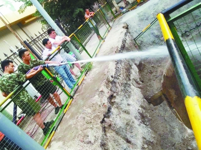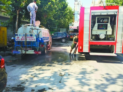 在管道內淤泥疏松后,需大量的水對管道內進行沖洗,為保證用水,市消防局安排了一輛消防車專門支持管道沖洗。據(jù)悉,消防車一次能提供15立方米的水,可以使用半小時。但工地附近無消防栓,每次加水均要回到消防隊,導致施工難度大、功效低。